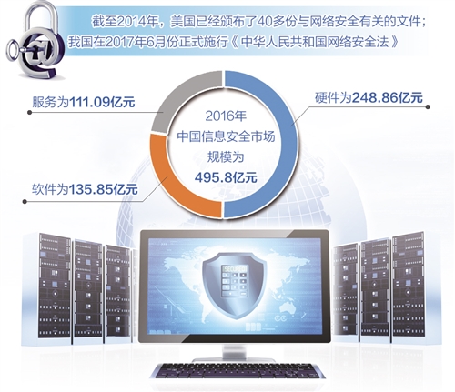 数据显示,目前国内网信安全市场的体量还很小,2016年中国信息安全市场规模为495.8亿元,其中硬件为248.86亿元,软件为135.85亿元,服务为111.09亿元。