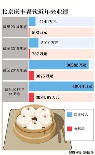 庆丰包子铺近年来快速扩张:2014年营业收入0.4亿元,2015年营收0.59亿元,2016年升至3.6亿元。净利润方面,2014年为503万元,2015年升至787.65万元,2016年为3075.76万元。这意味着其去年营收和净利润增幅分别约为5倍和3倍。