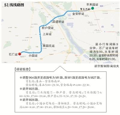 目前,S1线开通试运营区段为门头沟石厂站至金安桥站,且独立运行,不与既有线网换乘。市民可从地铁苹果园站上车,乘坐941快、325路、892路等公交汽车抵达金安桥站附近,平均耗时20分钟左右。据市交通委主任周正宇介绍,苹果园枢纽将于春节后进行封站改造。另外,S1线预计明年底和6号线西延贯通。届时,S1线将有2座换乘站。