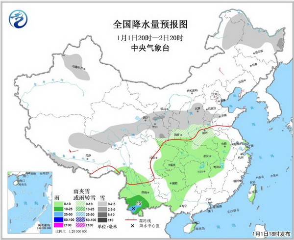 1月1日20时至2日20时,青海东南部、西北地区东部、山西大部、河北南部、河南中北部、黑龙江中北部、内蒙古东北部等地的部分地区有小雪或雨夹雪天气,局地有中雪;云南大部、西南地区东部、江淮西部、江汉大部、江南西部及海南岛东部等地有小到中雨,局地大雨;内蒙古中东部等地有4~6级风。