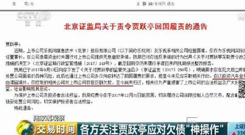 2017年12月25日,北京证监局再次责令贾跃亭在12月31日之前回国。通告称,贾跃亭以投资汽车业务及融资为由滞留境外,其控制的相关公司对上市公司存在巨额欠款,至今尚未归还,相关行为严重侵害了上市公司的合法权益及广大投资者的切身利益,社会影响极其恶劣。
