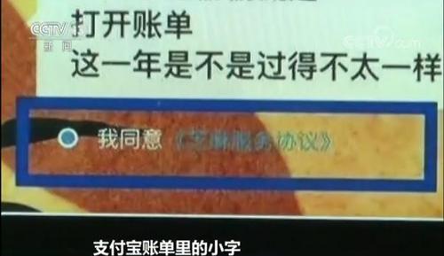 3日,支付宝推出了个性化的年度账单,许多消费者纷纷打开查看并分享在朋友圈。但打开账单时,多数人都忽略了一行特别小的字——“我同意《芝麻服务协议》”,并且这个协议是默认勾选同意。这意味着什么呢?有律师表示,同意这个协议,就意味着允许支付宝收集用户的信息,包括第三方保存的信息。而根据《消费者权益?;しā?,消费者有选择权,而不是商家替消费者选择。