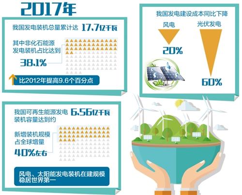 “2017年,我国发电装机总量累计达17.7亿千瓦,其中非化石能源发电装机占比达到38.1%,比2012年提高9.6个百分点,是历史上增长最快的时期?!惫夷茉淳志殖づぐ卓肆ν嘎?,2017年,我国可再生能源发电装机容量约6.56亿千瓦,新增装机规模占全球增量40%左右。风电、太阳能发电装机在建规模稳居世界第一,成为全球非化石能源发展的引领者。