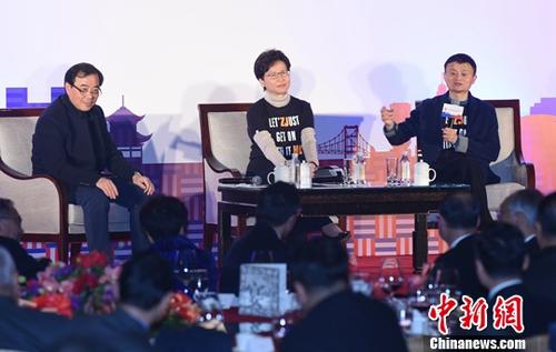 1月8日,阿里巴巴集团董事局主席马云(右)与香港特区行政长官林郑月娥(中) 对谈。浙商总会在香港成立分会,并於当日举行成立仪式。中新社记者 谭达明 摄