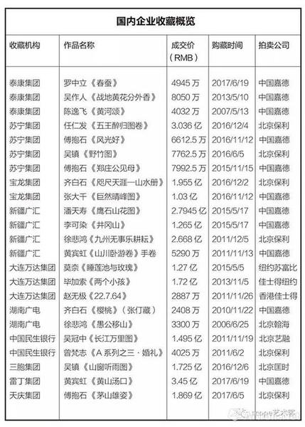 企业收藏的介入使得艺术市场的消费层次得到事实的升级,企业对美术馆级别藏品的追逐,也成为目前艺术市场上行最重要的驱动力量。近几年,受宏观经济波及,艺术市场面临深度盘整,作品的优胜劣汰趋势非常明显,而在这一形势中诸多企业藏家或机构入场,例如泰康集团、苏宁集团、宝龙集团、华谊兄弟、三胞集团、湖南广电、新疆广汇、复星集团、大连万达集团、侨福集团、中国民生银行等,已然成为艺术市场一股势力雄厚的购买力量。越来越多的企业进入到艺术品市场,紧盯高尖拍品,迅速占有资源,充分利用资本优势将典藏级别的珍稀作品收入囊中。优质艺术品资源正在经历着一轮新的流动和再分配,新的格局也似乎在此中酝酿。