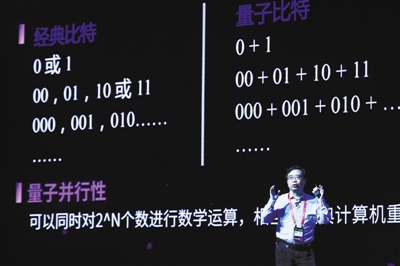 中国科学院郭光灿院士曾这样解释量子计算机的计算能力。他说,量子比特可以制备两个逻辑态0和1的相干叠加态,换句话讲,它可以同时存储0和1??悸且桓鯪个物理比特的存储器,若它是经典存储器,则它只能存储2N个可能数据当中的某一个;若它是量子存储器,则它可同时存储2N个数据。而且随着N的增加,其存储信息的能力将呈指数级上升。