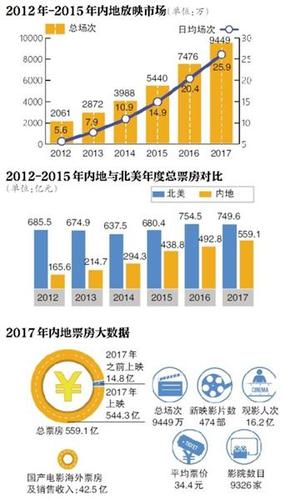559. 1亿。当去年中国电影年度总票房数据最终停留在这个数字上时,业内业外都为影市回暖取得的成绩倍感振奋。虽然最终年票房未能突破600亿的“小目标”,但如今的成绩也无疑是张华丽的成绩单,依然创下了历史新高。纵观2017年内地取得的票房成绩已是北美票房(全年110.66亿美元,折合749.6亿人民币)的3/4,可见中国市场全面超过北美、成为全球第一大电影市场应该指日可待。如此漂亮的成绩单背后有怎样的数字秘密,票房的贡献来源于谁?档期风云争霸赢家是谁?黑马频出的一年影片各有何贡献?观众品位日益提高的又有什么新的受众特点?对此,新京报采访多位业内人士,独家梳理2017年电影票房表现,罗列重点数据,盘点影片及市场表现,总结成绩及发展走向、各影市公司业绩及热门电影事件。