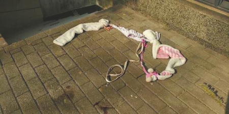 在小狗摔落的水泥地处,正上方就是何某的卧室窗户,地上还有血迹,记者在这里找到了一段结绳,上面还有血迹。在柯基犬“莱恩”跌落的地方,还发现了一个狗窝,狗窝的枕头散落在一边。