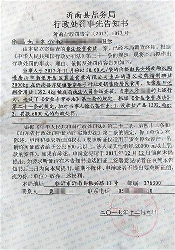 唐山市冀盐食盐有限公司对新京报记者称,2018年1月8日,其在山东临沂罗庄区经营调料生意的一位客户收到罗庄区盐务局的行政处罚事先告知书。告知书显示,该客户违规购销盐产品,违反了《食盐专营办法》第十六条“食盐零售单位应当从食盐定点批发企业购进食盐”的规定,拟没收盐产品84kg。