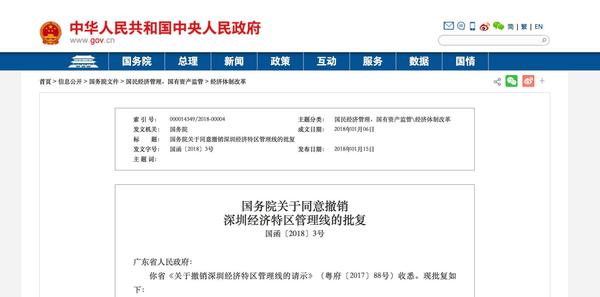 国务院关于同意撤销深圳经济特区管理线的批复