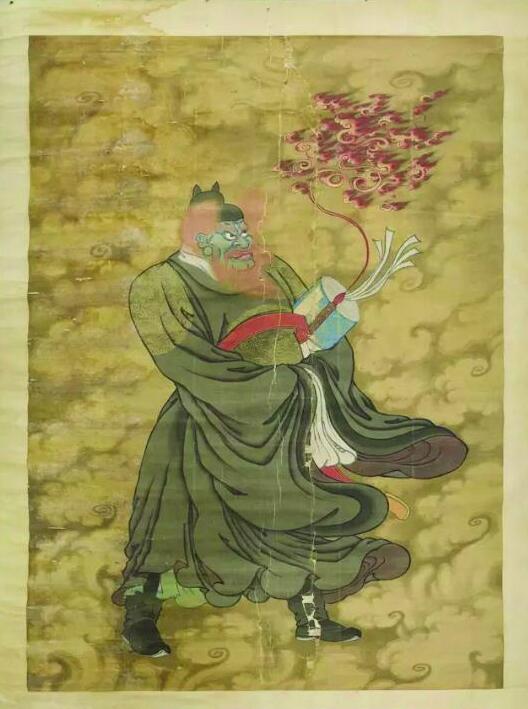 进入博物馆,穿过一座漂亮的带廊柱的门廊,我来到了178号展厅。突然,我的目光被一幅古画(见图)吸引住了:画中人物面呈蓝色,着青灰色衣袍,手抱书卷,腾云驾雾。因为画幅巨大,人物表情生动传神,一看就是来自中国的古代杰作。