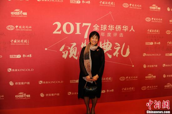 1月10日,由中国新闻社主办、中国侨网承办的“2017全球华侨华人年度评选颁奖典礼”在北京隆重举行。图为加拿大安大略省华裔议员黄素梅亮相红毯。中新网记者富宇摄