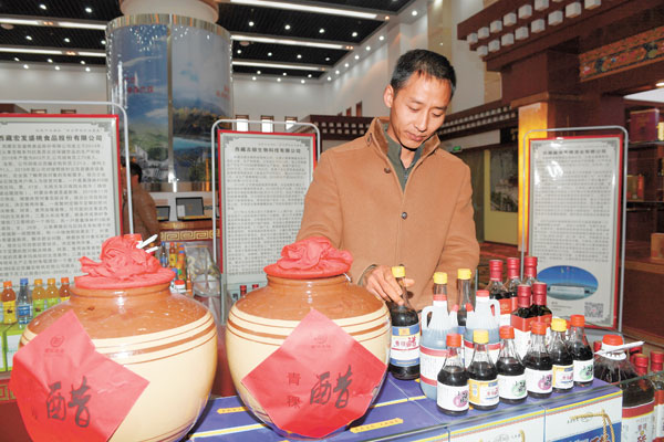 西藏吉顺生物科技有限公司的员工展示公司新产品——青稞醋。记者李洲 唐斌摄