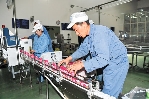 西藏高原之宝牦牛乳业股份有限公司员工正在生产线上分拣乳制品。记者李洲 唐斌摄