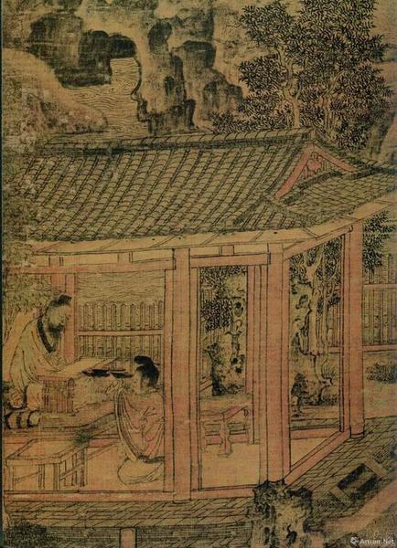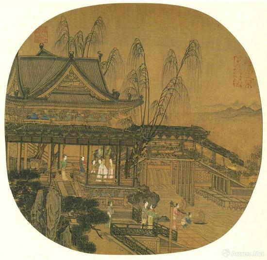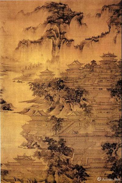 北宋郭忠恕《明皇避暑宫图》?;泄医ㄖ晡白忱觯峁垢丛?,细密精工,造型准确逼真。也有人认为,这幅画其实是元代李容瑾的作品。