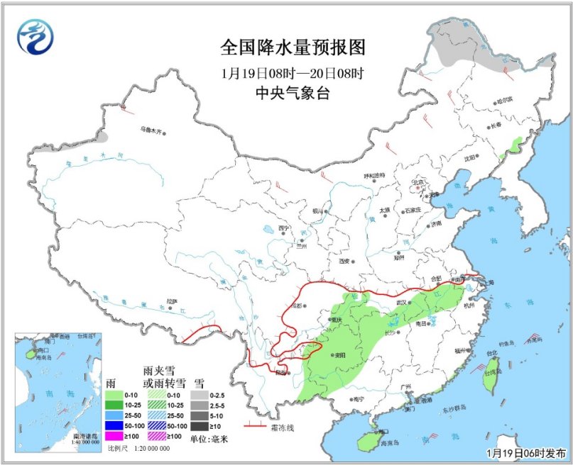 19日08时至20日08时,内蒙古东北部、黑龙江西北部等地的部分地区有小雪或阵雪;西南地区东部、江南北部、华南东部沿海、广西西部、海南岛、台湾等地有小雨。内蒙古、黑龙江北部等地有4~5级风(见图2)。