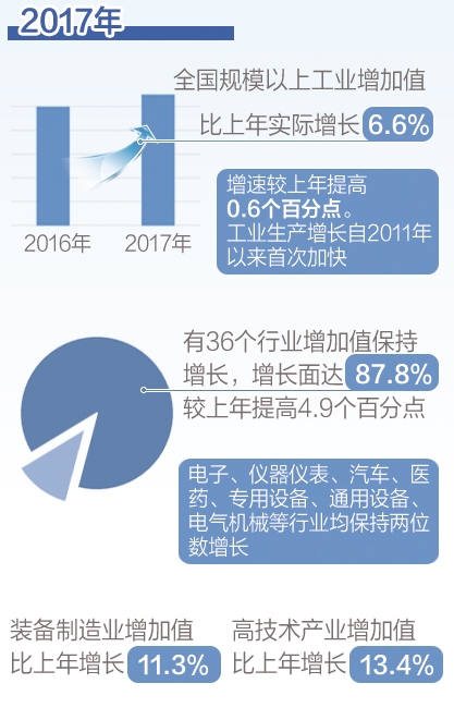 2017年,全国规模以上工业增加值比上年实际增长6.6%,增速较上年提高0.6个百分点。工业生产增长自2011年以来首次加快。