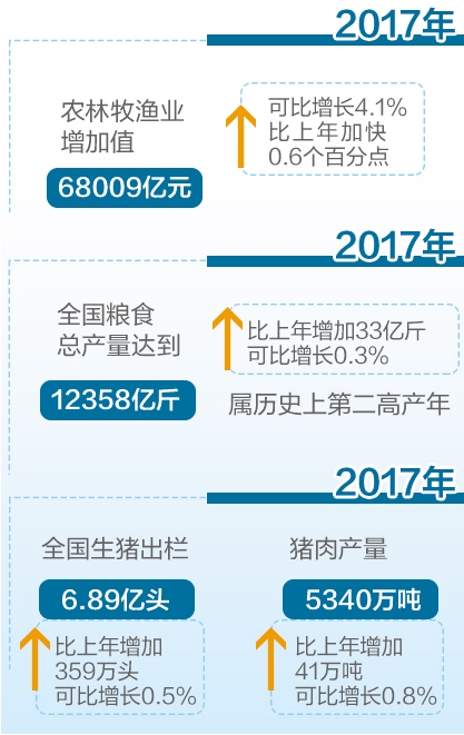 生猪生产恢复性增长。由于2016年生猪价格上涨幅度较大,尽管2017年上半年价格回落,但养殖仍有一定收益,养殖户(场)稳步补栏,2017年生猪生产恢复性增长。据统计,2017年全国生猪出栏6.89亿头,比上年增加359万头;猪肉产量5340万吨,增加41万吨。
