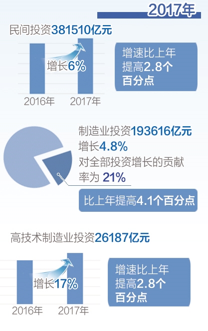 2017年,中央促进民间投资稳定增长的各项政策措施效果显现,民间投资整体回暖向好,自3月份起各月增速均比上年同期有不同程度提高,与全部投资增速之间的差距逐步缩小。2017年,民间投资381510亿元,增长6%,增速比1月份至11月份提高0.3个百分点。