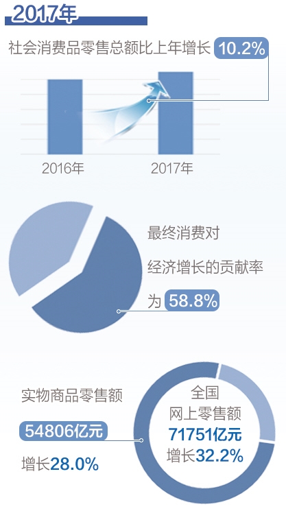 国内消费保持平稳较快增长,是经济增长的主要驱动力。2017年,最终消费对经济增长的贡献率为58.8%。