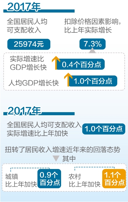 居民收入增长快于经济增长。2017年,全国居民人均可支配收入25974元,扣除价格因素影响,比上年实际增长7.3%,实际增速比GDP和人均GDP增长分别快0.4和1.0个百分点。