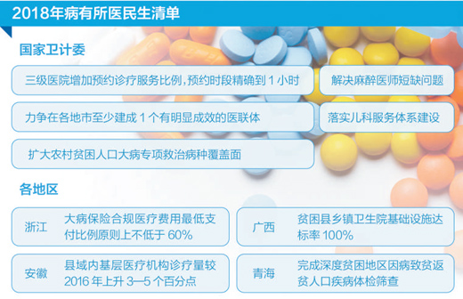 在地方,河南所有二级公立医院和政府办基层医疗卫生机构将全部参与医联体建设,安徽医共体建设要实现全覆盖;北京、江苏、黑龙江将实施统一的城乡居民医保制度;青海将完成深度贫困地区因病致贫返贫人口疾病体检筛查……实现“病有所医”关系千家万户,目前,多省份正陆续出台惠民政策,缓解看病难、看病贵问题。