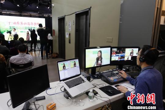 1月20日,《侨报》第六届华舆杯美国少年儿童中文大赛总决赛在纽约举行,工作人员操作网络直播控制台。廖攀摄
