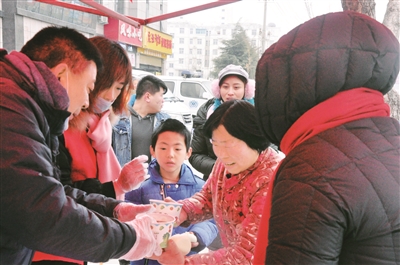 1月24日,九三学社河南商丘一支社与柘城县爱心粥棚一起,发起向环卫工人、孤寡老人、交通执法者等群体的免费送粥活动。图为爱心志愿者在向群众送发腊八粥。