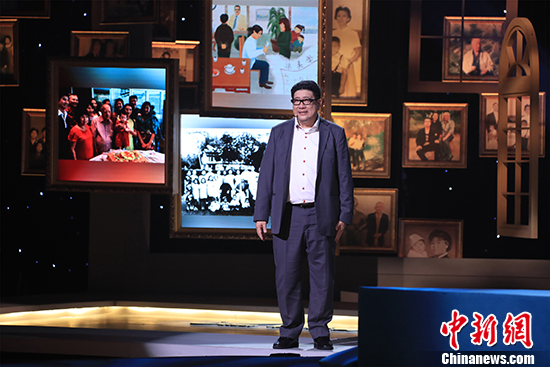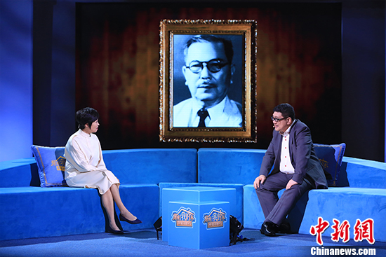 陈君宝(右)与主持人敬一丹(左)在录制现场,镜框中为陈嘉庚。中新社记者钟欣摄
