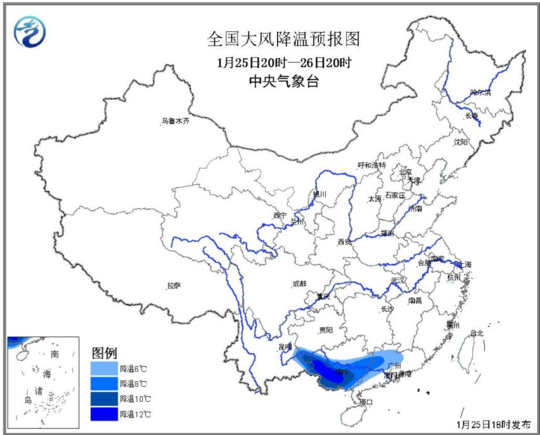 受强冷空气影响,25日至26日,我国中东部部分地区仍有4~5级偏北风,江河湖面阵风6~7级,东部和南部部分海域有6~8级、阵风9级的大风;西南地区东南部、华南西部和北部等地气温下降6~8℃,部分地区降温幅度可达10~12℃;期间,最低气温0℃线将南压至江南东北部至广西东北部、贵州南部等地,-10℃线位于黄淮东部-华北南部-西北地区东部一线;北方和中东部大部地区日平均气温较常年同期偏低2~5℃,部分地区偏低6℃以上。中央气象台1月25日18时继续发布寒潮蓝色预警。