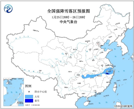 过去24小时,陕西中部、河南南部、湖北北部、安徽中部、江苏西南部、浙江北部等地出现了大到暴雪,局地有大暴雪,上述大部地区积雪深度达到5厘米,部分地区积雪深度10-15厘米。预计,25日20时至26日20时,安徽东南部、浙江中北部以及江西北部、重庆东南部、湖南北部等地的部分地区仍将有大雪,其中,浙江西部的部分地区有暴雪(10~15毫米)。上述地区新增积雪深度4~8厘米,局地可达10~12厘米。此外,湖南北部、贵州东北部有冻雨。
