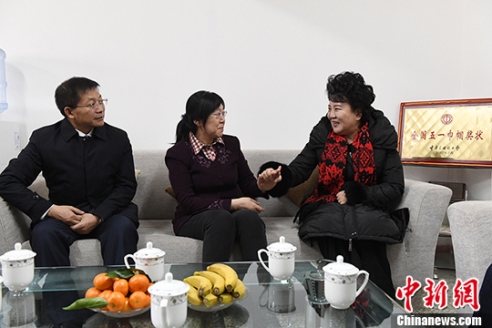 1月25日,国务院侨务办公室主任裘援平(右)、兰州市市长张伟文(左一)在兰州看望、慰问美国归侨张红(左二)。中新社记者杨艳敏摄
