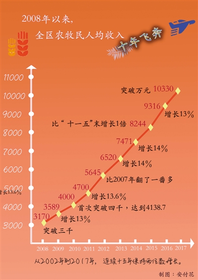 农村居民人均可支配收入破万,不仅为全区到2020年全面建成小康社会打下了坚实的物质基础,也为西藏农牧业发展、农牧区经济增长和农牧民增收提振了信心、积累了经验。(记者毛娜)