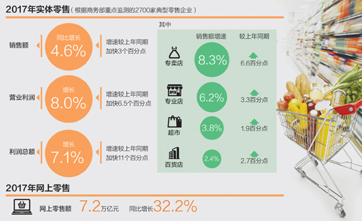 商务部近日发布的数据显示,去年我国实体零售发展态势良好,重点监测的2700家典型企业销售额同比增长4.6%,增速较上年同期加快3个百分点。去年我国网上零售额突破7.2万亿元,同比增长32.2%。