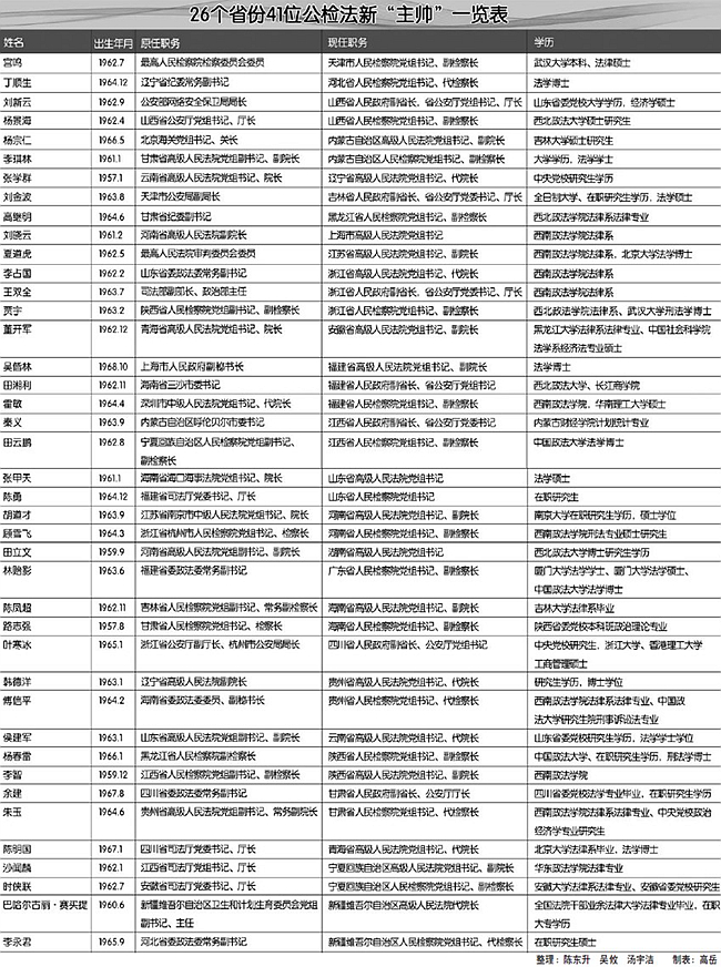 就来历而言,在41位公检法新“主帅”中,中央、国家机关“空降”的5人,省份之间交流任职的34人,本省交流任职的2人。这其中,原担任司法部副部长的1人,原担任最高人民法院、最高人民检察院专委的2人,原担任公安部网络安全保卫局局长1人,原担任海关关长的1人,原担任省高级人民法院院长的2人,原担任省公安厅厅长的1人,原担任省检察院检察长的1人,原担任省委政法委常务副书记的5人,原担任省纪委副书记的2人,原担任省高院副院长的5人,原担任省检察院副检察长的5人,原担任直辖市公安局副局长的1人,原担任省司法厅厅长的5人,原担任省会城市公检法“一把手”的3人,原担任海事法院院长的1人,原担任特区市中级人民法院院长的1人,原担任市委书记的2人,原担任直辖市政府副秘书长的1人,原担任自治区卫计委主任的1人。