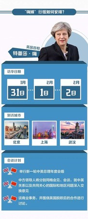 应国务院总理李克强邀请,英国首相特雷莎·梅将于1月31日至2月2日对中国进行正式访问,并举行新一轮中英总理年度会晤。