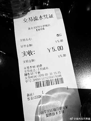 网友展示在KTV被收5元“版权费”的单据