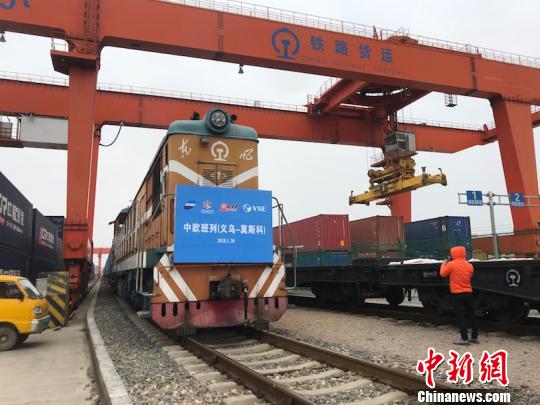 中新网义乌1月30日电(记者 奚金燕)30日下午,中欧班列(义乌-莫斯科)从义乌铁路西站首发启程,驶往俄罗斯莫斯科。此趟班列共50车100个标箱,满载着箱包、袜子、衣架、收音机等义乌小商品货物。
