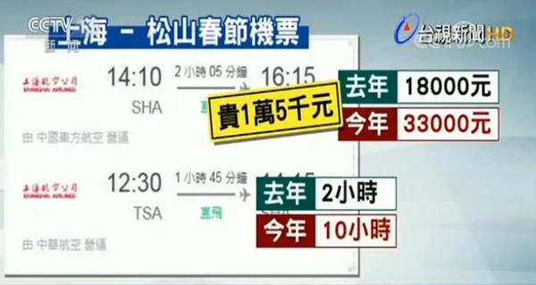 岛内媒体比较了一下去年同期从上海到台北松山机场的往返机票后发现,去年只要18000新台币,今年却要33000元,足足贵了15000元,原本直飞2个小时就可以到,现在许多人都得转机,耗费将近半天,多了8个小时。
