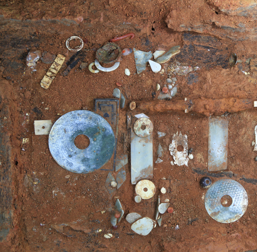 据香港《东方日报》网站1月31日报道,五号墓位于墓园北部,在海昏侯刘贺墓的正北方。?;韬钅乖嵛奈锉;ぜ凹际醣U细涸鹑?、中国社科院考古研究所副研究员李存信表示,清理五号墓时发现,墓主头部被漆器叠压,头下则枕着玉圭、玉枕,颈部有玉组珮,腰部有玉带钩、水晶、玛瑙、玉具剑等。经分析,这些文物多属新疆和田玉料,见证西汉时期丝绸之路与中西文化交流的历史。