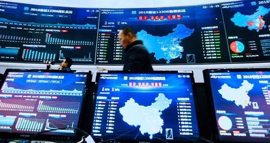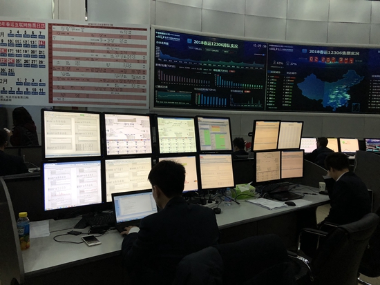 2月2日,中国铁道科学研究院全路客票系统监控中心,最大的三块屏幕显示着2018春运12306售票实况、分控实况和排队实况。视觉中国供图