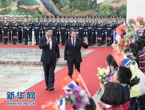 1月9日,国家主席习近平在北京人民大会堂同法国总统马克龙举行会谈。这是会谈前,习近平在人民大会堂北大厅为马克龙举行欢迎仪式。新华社记者王晔 摄