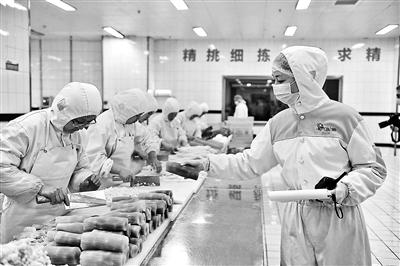 昨天,北京青年报记者走进北京京铁列车服务有限公司餐食生产基地探访。从早上8点开始,各种种类的盒饭就开始进行生产制作了。进货检验、毛菜处理、精加工、炒制、快速降温、称重包装、金属异物检测、抽检留样……一盒高铁盒饭的生产出炉要经过大大小小十几道工序,食品安全总被放在第一位。