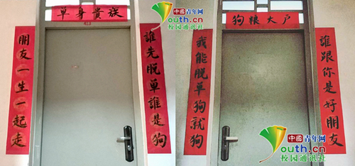 “单身贵族”VS“狗粮大户” 高校对门宿舍学生贴春联“互怼”