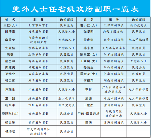 从政治面貌来看,北京市副市长王红、山西省副省长张复明、湖南省副省长何报翔、山东省副省长孙继业、江苏省副省长陈星莺、贵州省副省长王世杰是民革党员,上海市副市长陈群、湖北省副省长杨云彦、河南省副省长霍金花、浙江省副省长成岳冲、甘肃省副省长张世珍是民盟盟员,江西省副省长孙菊生、黑龙江省副省长孙东生、宁夏回族自治区政府副主席杨培君是民建会员,云南省副省长李玛琳是民进会员,海南省副省长王路是农工党党员,天津市副市长曹小红、四川省副省长杨兴平是致公党党员,广西壮族自治区政府副主席李彬、辽宁省副省长孟庆海、重庆市副市长屈谦是九三学社社员,福建省副省长郑建闽是台盟盟员。同时,任省级政府副职的无党派人士有7位。