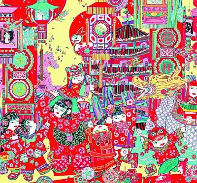纸上乾坤大,画里岁月长。美术文化在中华传统年节文化中一向扮演着重要角色。它与各种节俗交织在一起,在表达百姓祈福心愿、满足大众审美需求、记录民间年节习俗的同时,也使节日变得有文化起来。作家老舍的描述颇具代表性,三句话便拉近了吃穿与文化、与美术的距离:“除夕真热闹。家家赶做年菜,到处是酒肉的香味。男女老少都穿起新衣,门外贴上了红红的对联,屋里贴好了各色的年画。”春节中的美术创作也使得一些美术名家从小就与书画结下了不解之缘。徐悲鸿10岁时就开始为乡里人写“时和世泰,人寿年丰”等春联,这种百历锤炼的童子功为他后来成为书画大家奠定了坚实的基础。丰子恺在谈到自己和美术的缘分时曾说:“祭品盘上的红纸盖都是我的姑母剪的,‘福禄寿喜’‘一品当朝’‘平升三级’等字,都剪出来,巧妙地嵌在里头。我那时只有七八岁,就喜爱这些东西,这说明我与美术有缘?!?/p>