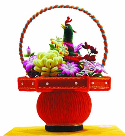 在旁边的三号馆工艺美术品类展厅里,同属观赏类玩具的绒鸟,让人一下子便置身一片五彩斑斓鸟类世界。绒鸟是北京著名的民间玩具,用金属丝密绞真丝呈绒毛状,制成各种飞禽走兽和人物造型,色泽明丽,质感独特。瞧,这淡黄色的真丝绒毛构成的一个个毛茸茸小球,便是假花丛中的小绒鸟,还有两只未长成的小翅膀,极为生动。在绒鸟传人李桂英的绒鸟作品《凤穿牡丹》里,一只艳丽的凤伫立于怒放的牡丹花丛中,格外喜庆,绒鸟这种民间玩具也渐成高档的室内观赏品。