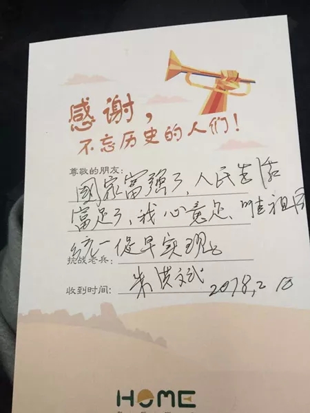老兵朱洪斌写给慰问组的留言