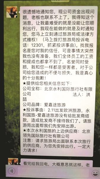 北青报记者了解到,部分行程已经开始的旅客,在旅行中途突遇变故,被要求补缴相关款项。其中,一名以9300元的价格,通过永利国际马连道家乐福店订购三亚游的旅客称,自己在旅途中被告知,需要“再交一份钱或自己订酒店机票”。除此之外,有旅客在境外行程中,被通知需要补交团费才能回国。多名尚未出行的旅客收到门店销售人员发来的信息,内容大同小异,均表示因公司破产,“老板找不到了”,无法继续顺利出行。销售人员宣称,“事情太突然我也没有一点准备”,并对旅客致歉,同时建议受损旅客向旅游主管部门投诉。