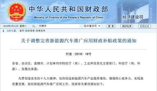 经济日报-中国经济网2月14日讯 昨日,财政部、科技部、工信部、发改委联合发布《关于调整完善新能源汽车推广应用财政补贴政策的通知》。通知对于2018年新能源汽车补贴的发放提出了新要求。